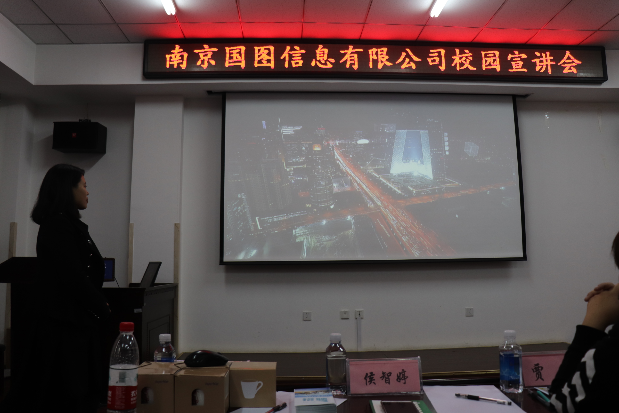 于新土壤楼102召开了南京国图信息有限公司专场宣讲会。出席本次会议的有南京国图信息有限公司沈阳分公司项目经理贾璐、东北地区综合事务管理员侯智婷、张蕾,学院辅导员范超老师、孙鑫老师、苏欣老师。学院本科、研究生毕业生及部分低年级同学参加宣讲会。