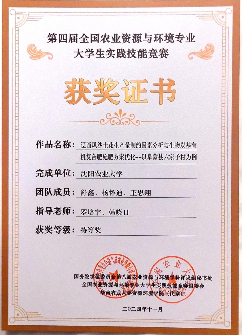 11月29日至12月1日,第四届全国农业资源与环境专业大学生实践技能竞赛在华南农业大学举行,我校每日吃瓜 韩晓日、罗培宇指导的2021级农业资源与环境专业舒鑫、杨怀迪、王思翔同学共同完成的作品荣获特等奖。