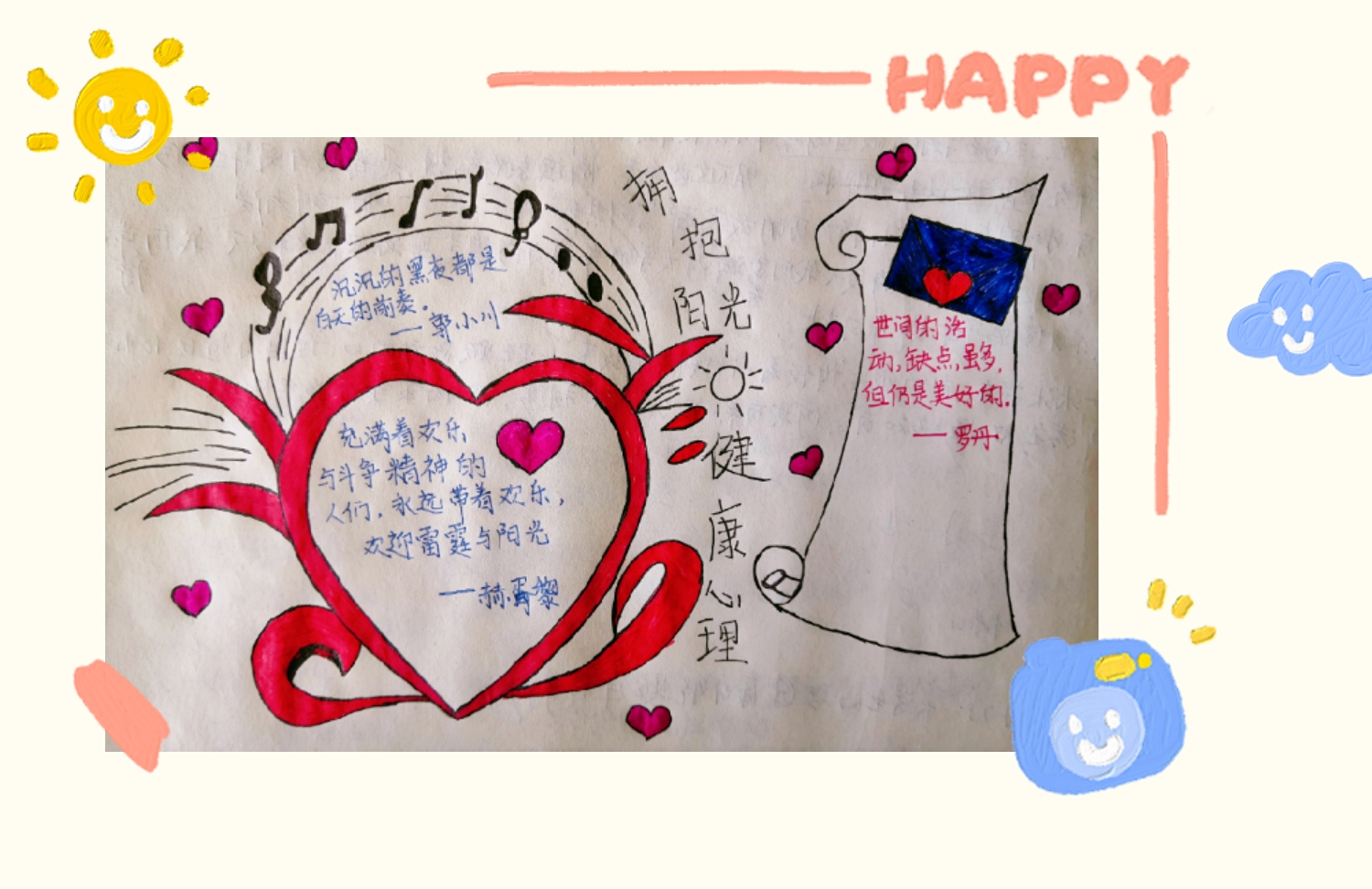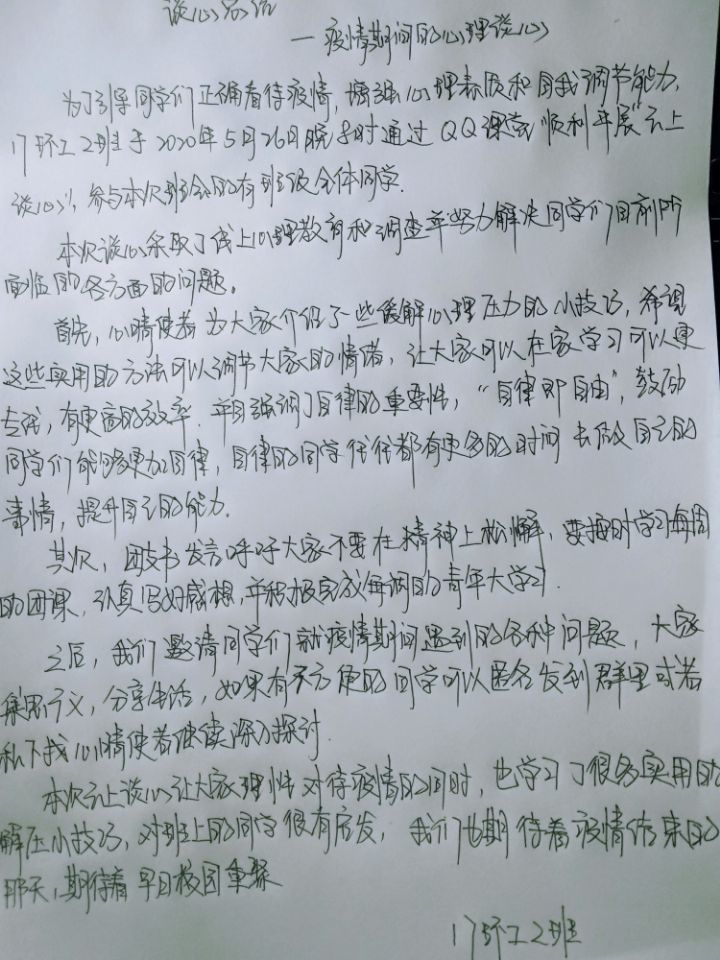 此次活动包含“最美微笑”“短视频征集”“手抄报征集”“疫情温暖分享”“守护天使”“疫情宅家生活交流会”六个板块。各班级心晴使者通过语音通话的方式为班级同学科普了疫情防控下解决不良情绪的办法。同学们也积极分享了疫情防控中的趣事、乐事、感人事,有的同学还以拍下笑容、录制“三行情诗”视频等方式,向疫情中在自己岗位恪尽职守的工作人员传递温暖,表达最诚挚的敬意。此次活动以丰富的表现形式充分体现出土环学子与国同心、奋力前行的决心,也让我们看到中华儿女风雨同舟,共济而行的团结模样。